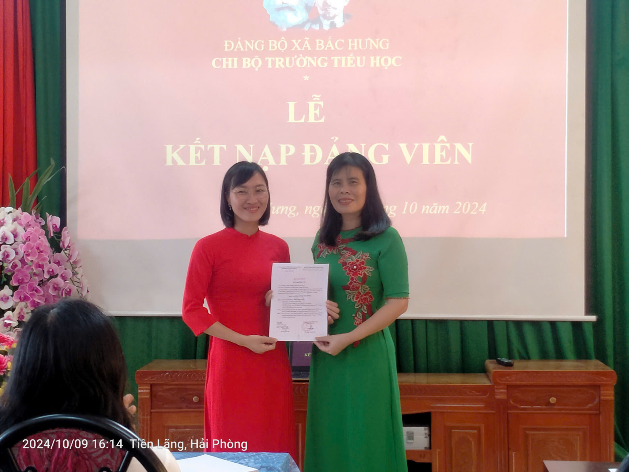 Thực hiện Quyết định số 12- NQ/CB ngày 24/8/2024 của Chi bộ trường tiểu học Bắc Hưng, Nghị quyết số 113-NQ/ĐU ngày 30 tháng 8 năm 2024 của Đảng uỷ xã Bắc Hưng, vào lúc 16h00’ ngày 09/10/2024, Chi bộ trường Tiểu học Bắc Hưng đã tổ chức Lễ kết nạp đảng viên cho quần chúng ưu tú Phan Thị Oanh, Kế toán trường Tiểu học Bắc Hưng.
